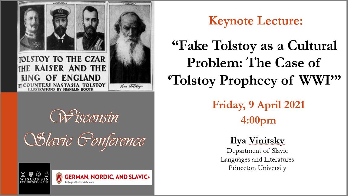The Keynote Lecture by Professor Ilya Vinitsky (Princeton University), titled “Fake Tolstoy as a Cultural Problem: The Case of ‘Tolstoy Prophecy of WWI,” will take place at 4:00pm -5:30pm on Friday, April 9 on Zoom. Professor Vinitsky’s description of the lecture is: “To the best of my knowledge, the real problem of the fake (or imaginary – “мнимый,” in Tynianov’s words) Tolstoy has never been examined by scholars. In this lecture, I will focus on a striking case of this phenomena, a sensational prediction of WWI communicated (arguably) by Tolstoy’s daughter (or grandniece) Countess Nastasia Tolstoi before his death and widely discussed in newspapers and pamphlets all over the world in the 1910s and 20s. I will try to identify the real author of this influential “vision” and interpret the latter within the context of the faker’s works, activities, and a system of beliefs. My project aims to develop a new interdisciplinary methodology for the analysis of the formation and cultural values of liars, forgers, and mystifiers.” This lecture is free and open to the public.