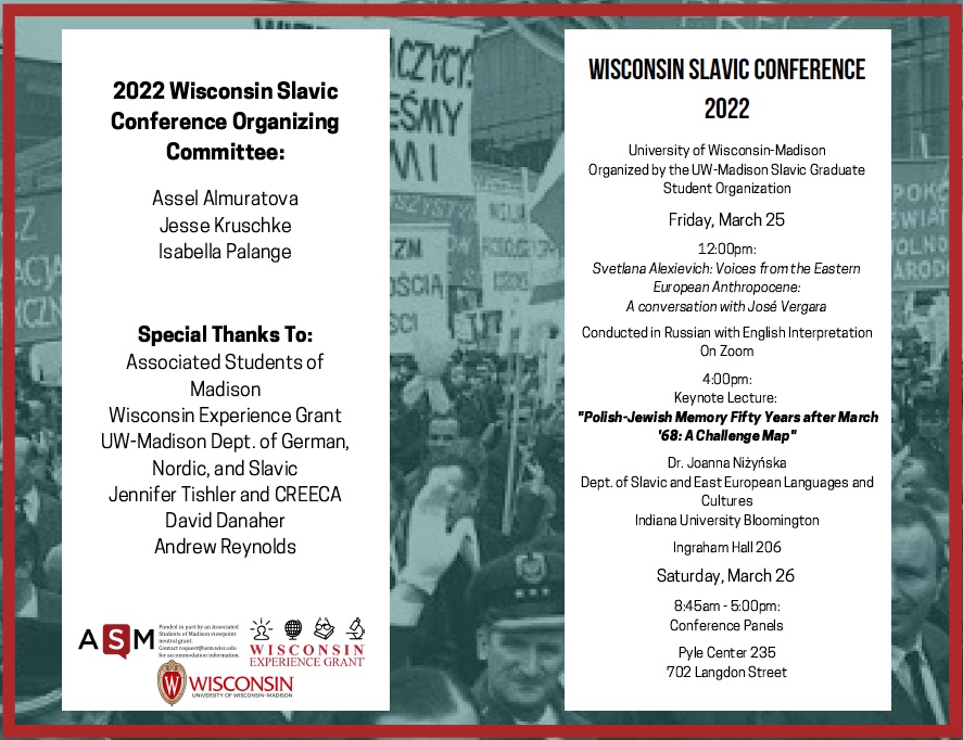 The WSC is an annual event planned and run by graduate students in Slavic Studies. We are grateful this year to support from Associated Students of Madison, a Wisconsin Experience Grant, GNS+, and CREECA.