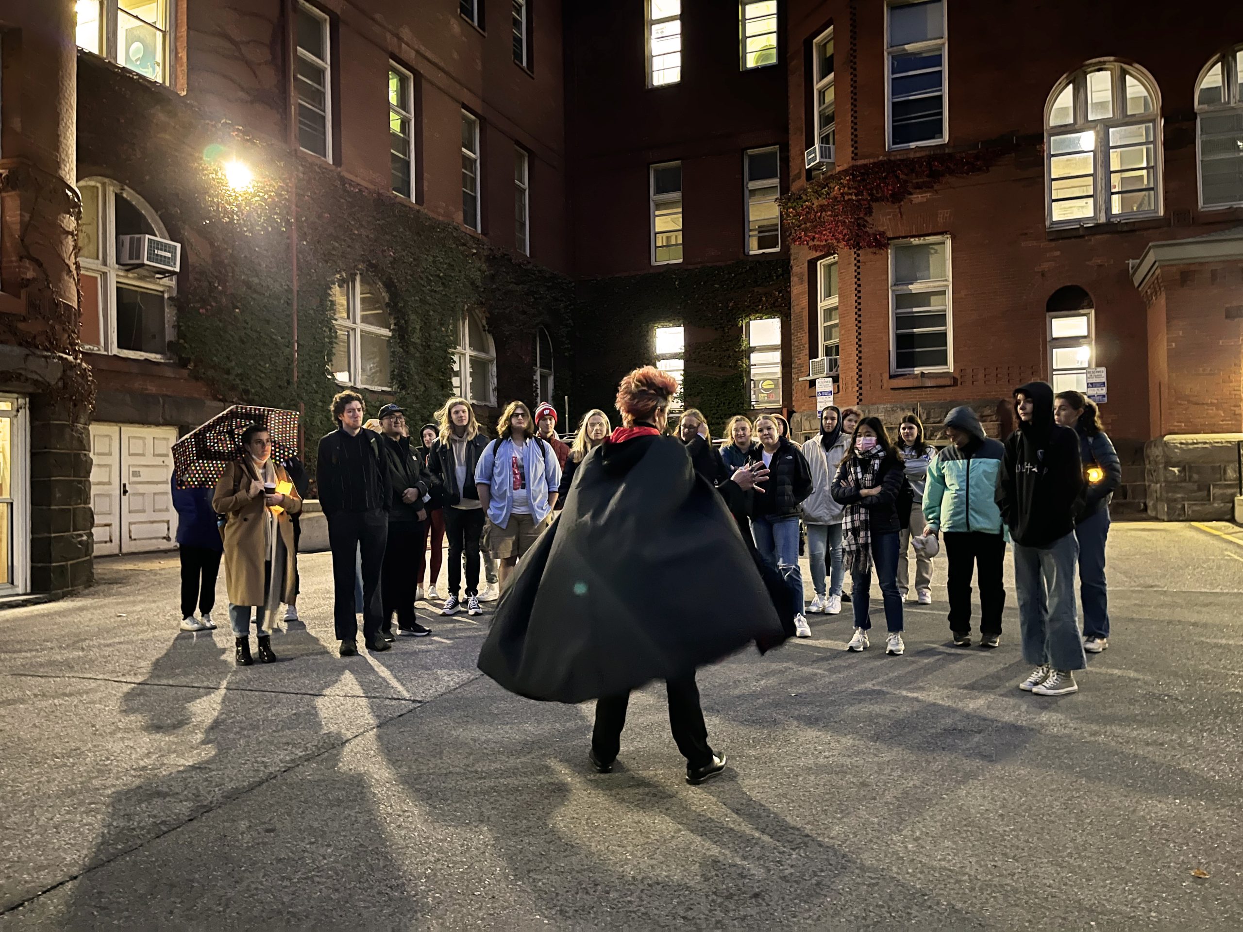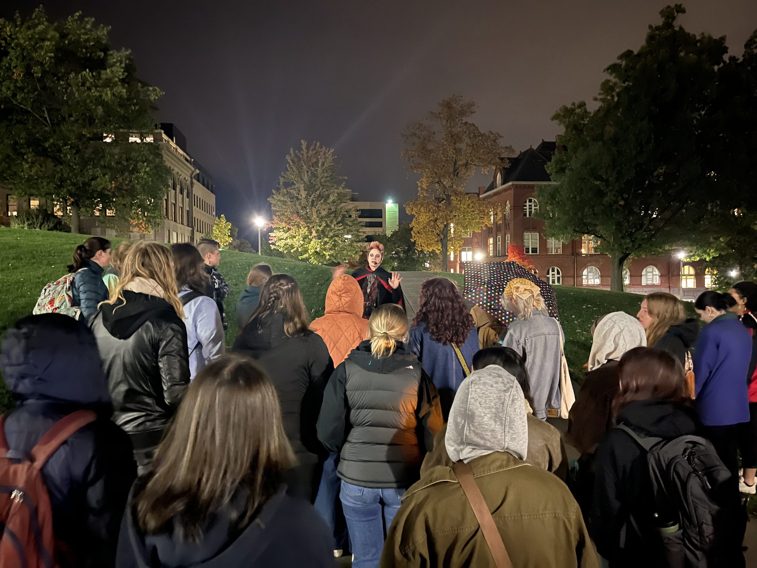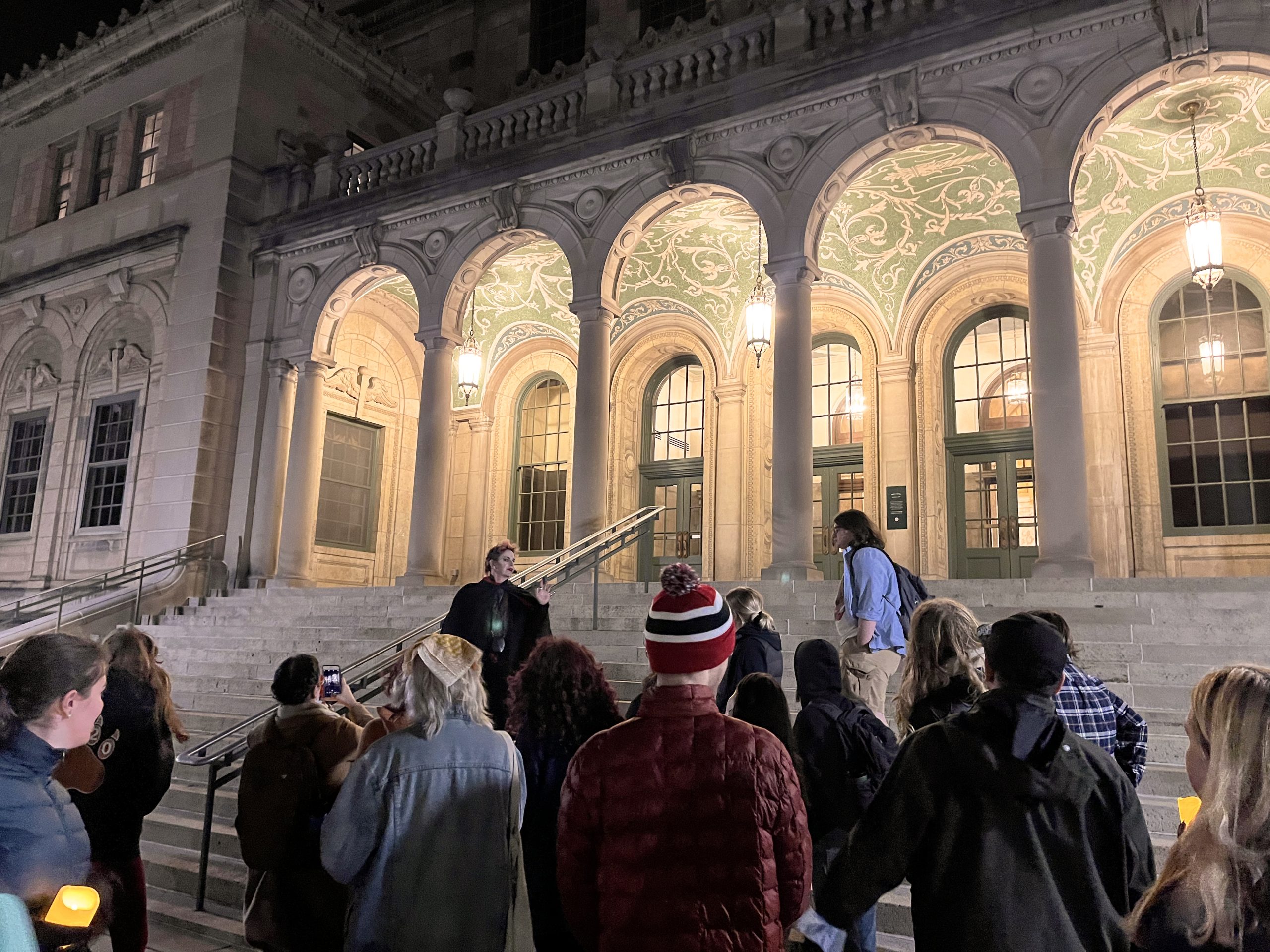 Despite (or perhaps because of?) the gloomy weather, we had a spectacularly spooky and intellectually stimulating supernatural UW tour last Wednesday evening, led by Madison Ghost Walks. Over 30 students showed up to prowl the campus hearing memorates, legends, FOAF tales, rumors, and other occult narratives, followed by a very illuminating presentation and Q&A by long-time local supernatural storyteller and ghost hunter (and former Madison firefighter!) Lisa Van Buskirk, who offered up some fascinating insights into her methods of researching Madison ghostlore, the ethics of haunted tours, and her choices as a professional performer of supernatural stories.