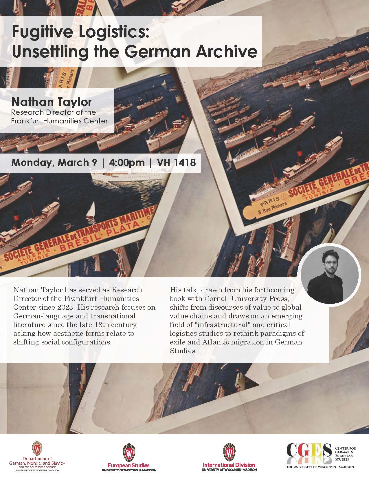 His talk, “Fugitive Logistics: Unsettling the German Archive,” is drawn from his forthcoming book of the same name with Cornell University Press. It shifts from discourses of value to global value chains and draws on an emerging field of ‘infrastructural’ and critical logistics studies to rethink paradigms of exile and Atlantic migration in German Studies.