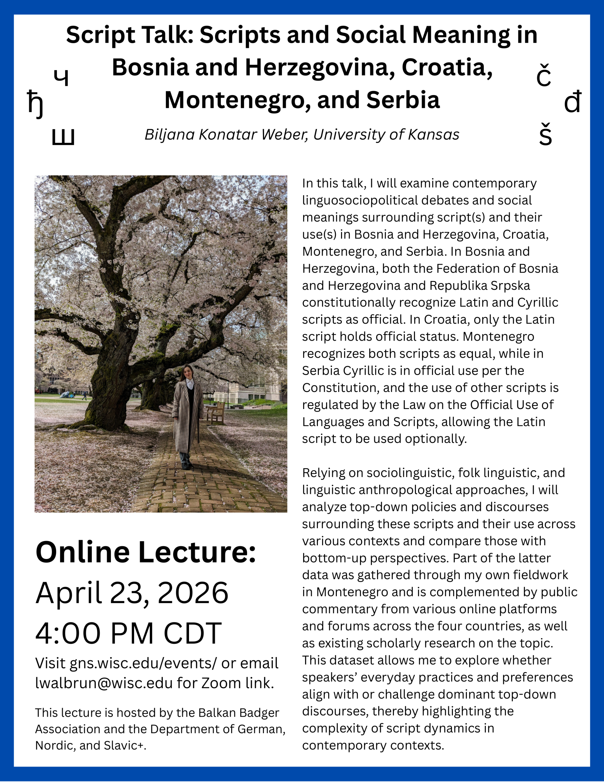 Abstract: In this talk, I will examine contemporary linguosociopolitical debates and social meanings surrounding script(s) and their use(s) in Bosnia and Herzegovina, Croatia, Montenegro, and Serbia. In Bosnia and Herzegovina, both the Federation of Bosnia and Herzegovina and Republika Srpska constitutionally recognize Latin and Cyrillic scripts as official. In Croatia, only the Latin script holds official status. Montenegro recognizes both scripts as equal, while in Serbia Cyrillic is in official use per the Constitution, and the use of other scripts is regulated by the Law on the Official Use of Languages and Scripts, allowing the Latin script to be used optionally.