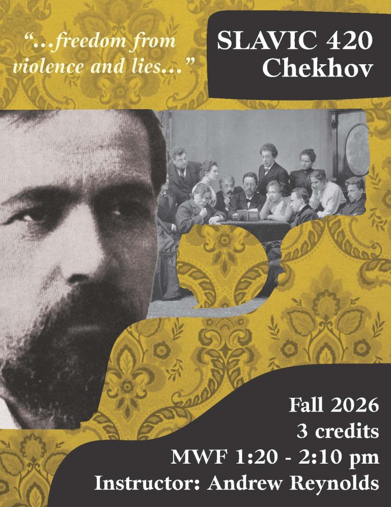 Course Description: This course introduces students to the life and works of Anton Chekhov (1860-1904). Through close reading and discussion of his short stories, novellas, and plays, students will learn about Chekhov’s treatment of such topics as childhood, religion, love and infidelity, death, mental illness, colonial expansion and the manifold dramas of modern life, while paying close attention to his developing artistic views and literary technique. All readings will be in English.